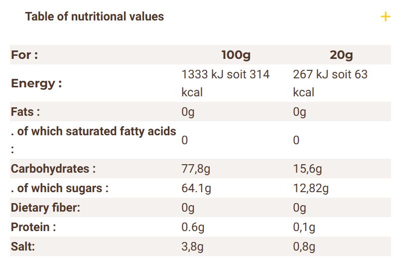 All ingredients Acacia honey* 94% Fleur de sel 4% (salt flower) Royal jelly* 2%. *: ingredient from organic farming
