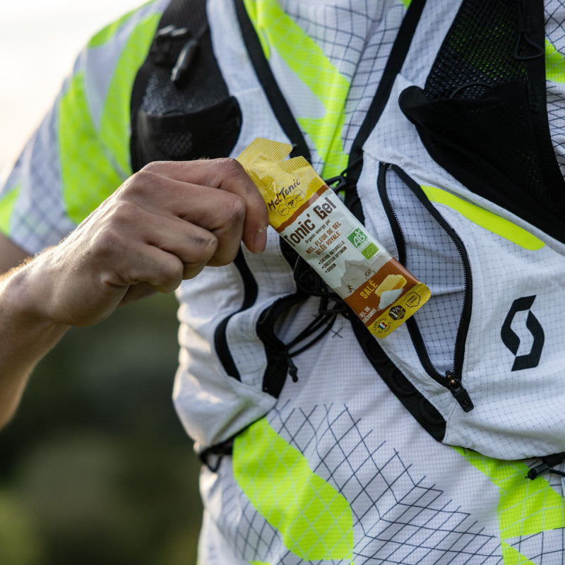 The salted organic energy gels with Honey, Flower of salt and royal jelly are consumed during the physical effort. Take a gel out of your pocket every 45 minutes or so to replenish your body and avoid energy deficiencies.