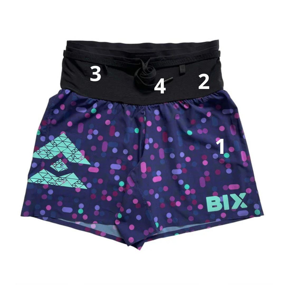Includes detachable race bib holders and internal key holder