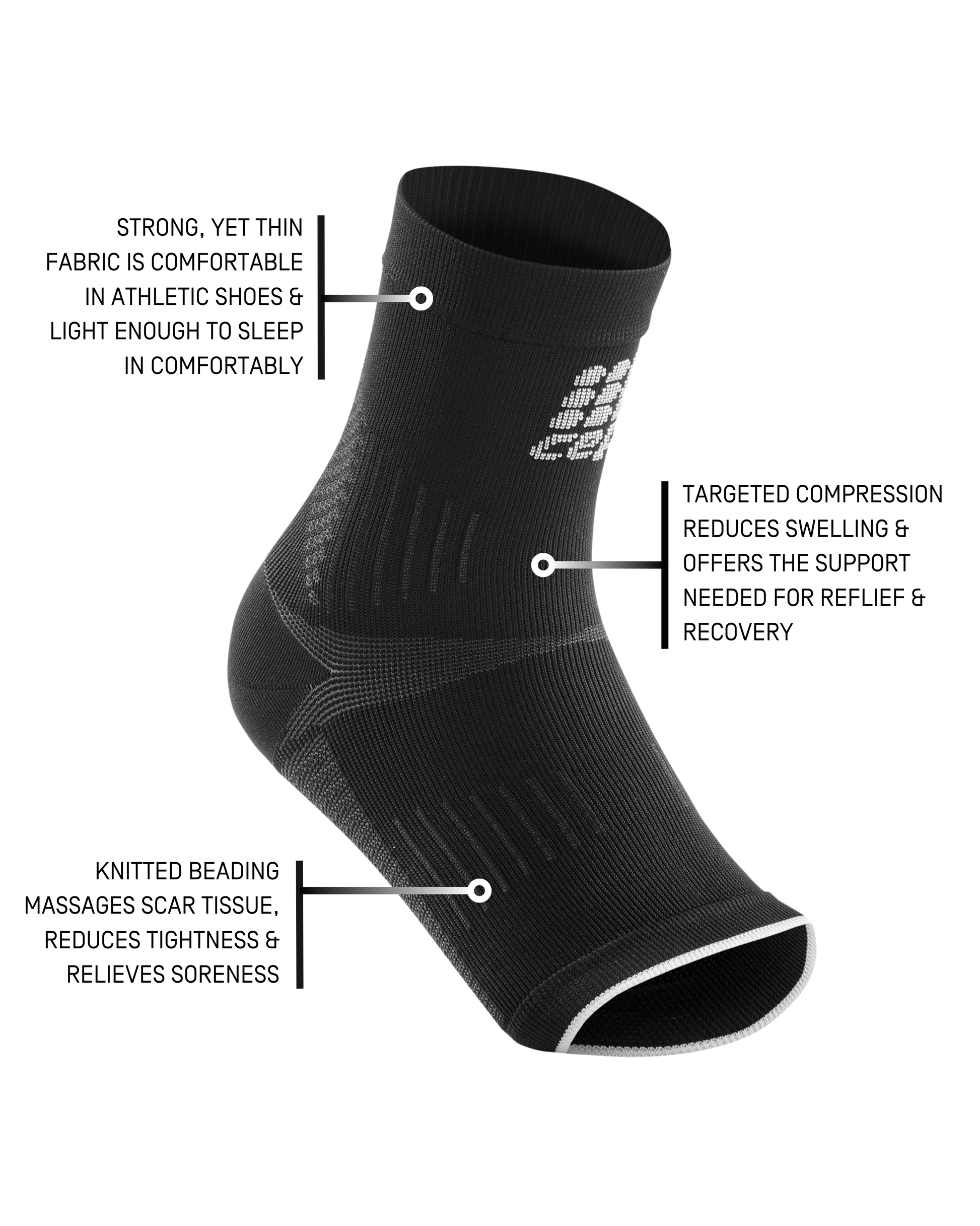 - Compression reduces swelling while stabilizing arch of the foot for relief