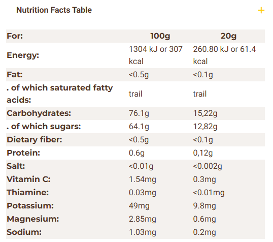 所有成分:薑黃根提取物* 黑胡椒種子* 蓮花蜂蜜* 89.5% 檸檬汁* 蜂王漿* 2.5% *: 來自有機農業的成分