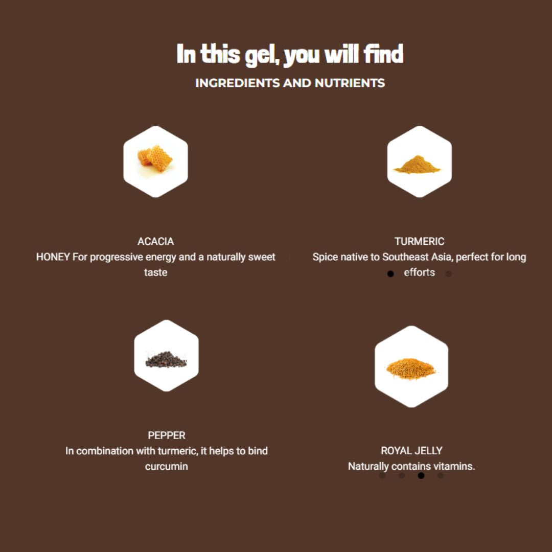 蓮花蜂蜜: 提供逐步能量和自然甜味, 薑黃: 產自東南亞的香料,適合長時間的努力, 胡椒: 與薑黃結合, 有助於結合薑黃素, 蜂王漿: 自然含有維他命