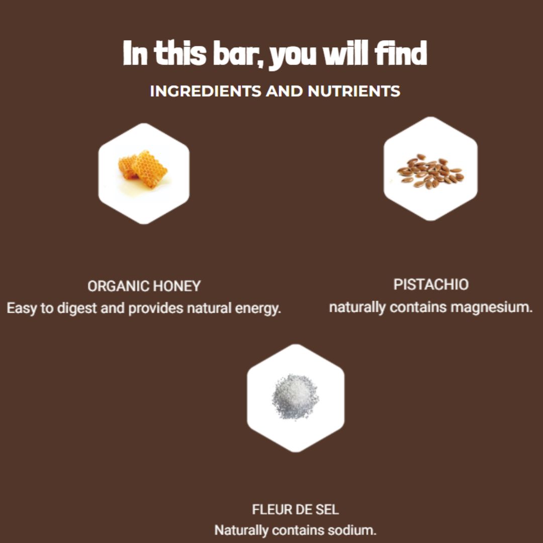 有機蜂蜜、開心果和蓋朗德鹽能量棒非常適合與能量飲料或水一起小口享用,以避免在運動過程中造成消化系統的負擔。無論是跑步、越野跑、馬拉松還是自行車(如山地自行車等),這款能量棒都能適應各類運動。